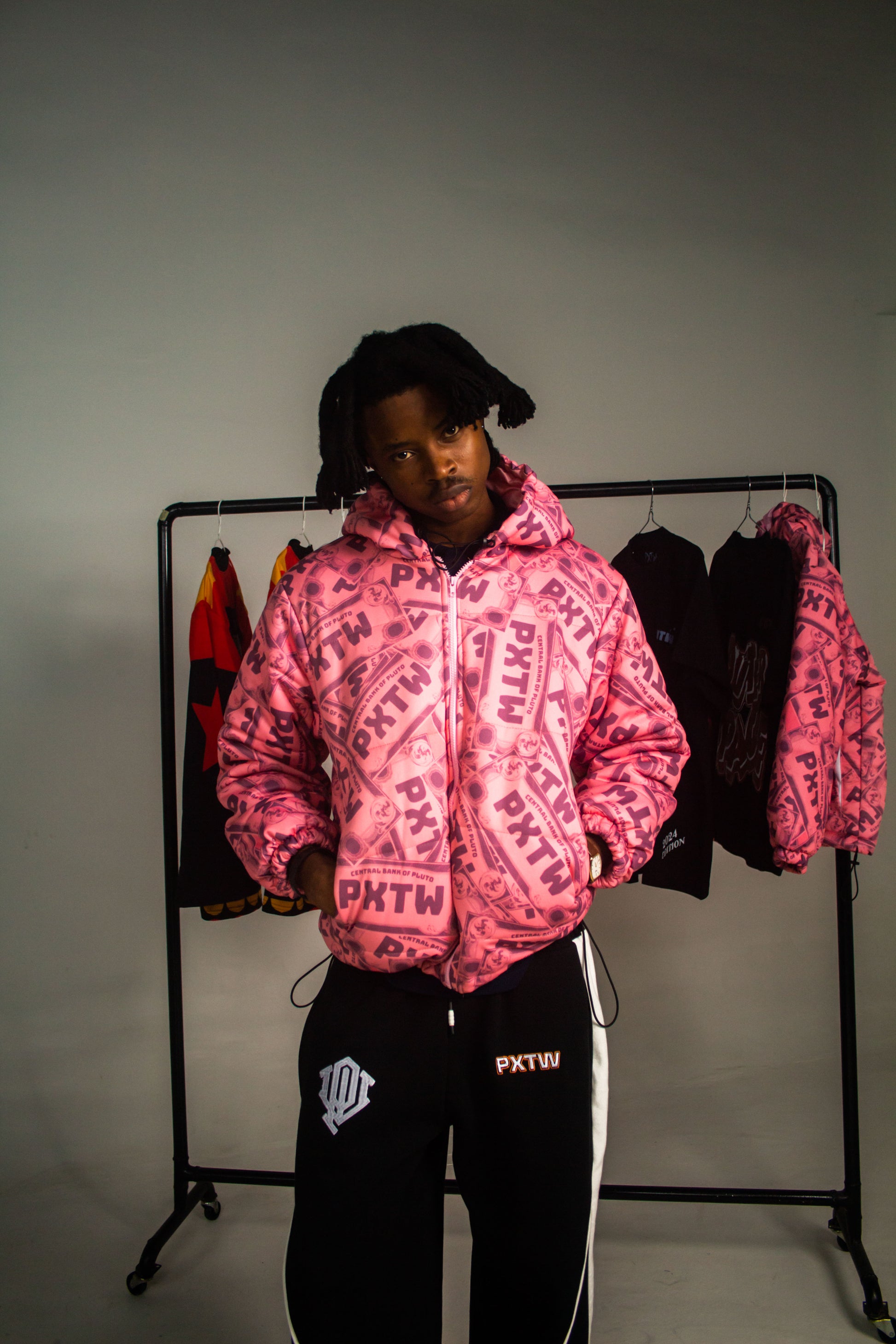 This pink puffer jacket features a unique personal currency design, making it a stylish and eye-catching addition to your wardrobe. With its all-around design, you're sure to stand out from the crowd while staying warm and comfortable. Upgrade your outerwear game with this statement piece.